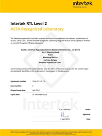 • 中國船級社產品檢測和試驗機構認可證書(有害物質)正面
