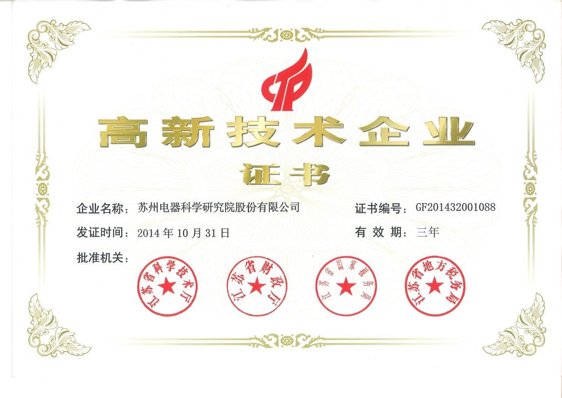 2011年5月,蘇州電器科學研究規范有限公司獲評高新技術企業。三年來,我院各方面都取得了長足的發展,充分發揮高新技術企業的優勢,進一步規范各項管理工作,堅持自主研發、技術創新,提升公司核心競爭力,不斷為客戶提供優質和高效的服務。