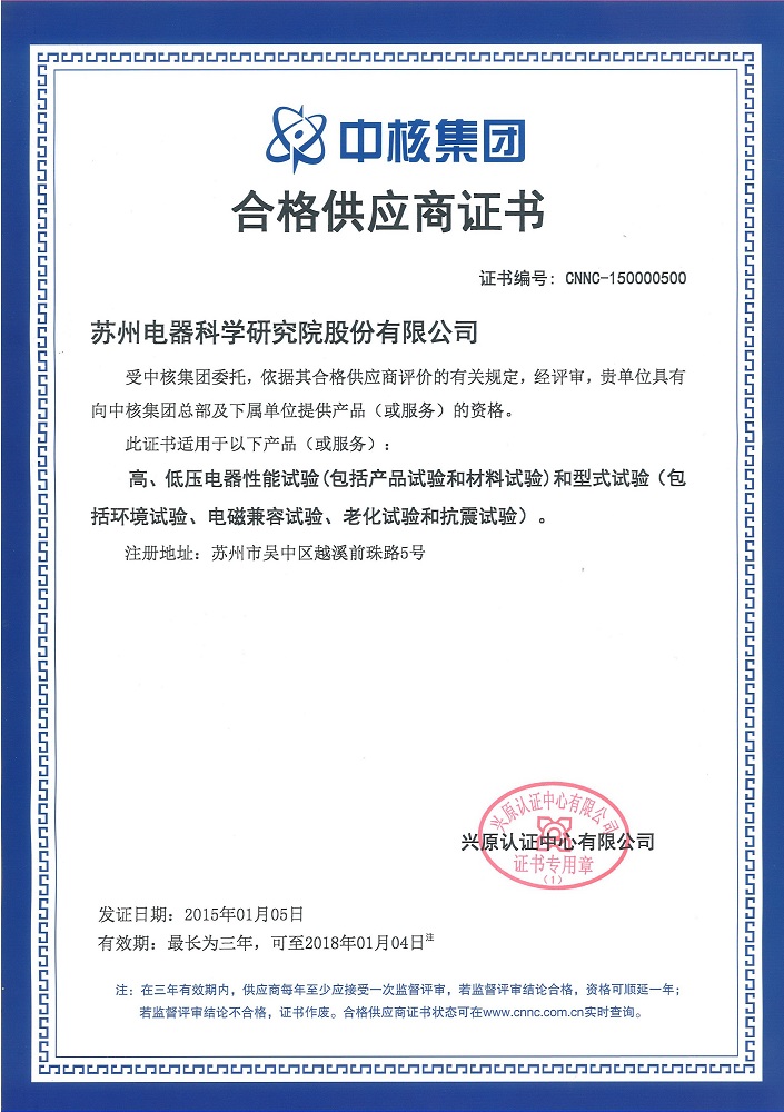 依據中核集團合格供應商評價的相關規定,取得該證書,我院具有向中核集團總部及下屬單位提供檢測服務的資格。適用的檢測服務包括:高、低壓電器性能試驗(包括產品試驗和材料試驗)和型式試驗(包括環境試驗、電磁兼容試驗、老化試驗和抗震試驗)。