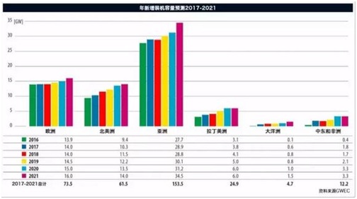 在南美洲, 盡管巴西的政治和經濟處于困境, 但該區域的其他國家正在填補風電市場的空白, 特別是烏拉圭和智利,以及這一區域中最令人關注的阿根廷。 非洲2017年也將經歷強勁增長, 由肯尼亞、南非和摩洛哥引領,非洲大陸上的未來發展圖景非常樂觀。 澳大利亞市場經歷了一個短暫的沉寂后,也開始展現出恢復的跡象,特別是擁有一個堅實的待建項目管道,將確保未來幾年風電的增長。