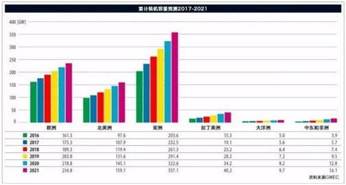 這些增長主要由亞洲國家引領:中國將繼續在全球市場處于領先地位;印度在過去一年也建立了一個新的裝機記錄,印度風電未來的發展潛力巨大,因為要完成政府雄心勃勃的風電發展目標。 與此同時,亞洲還有很多具有顯著發展潛力的新興風電市場。